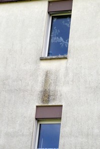 an die Hausfassade geblasen. Folge: Schmutz klebt am feuchten Putz,